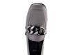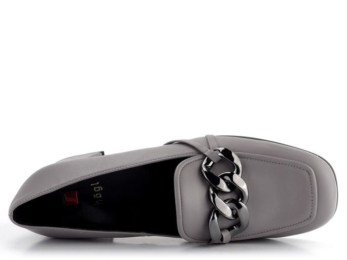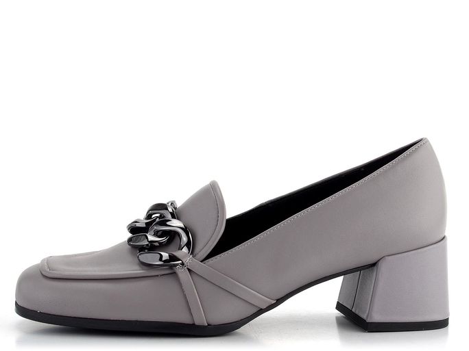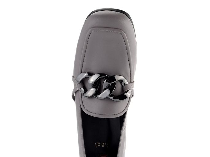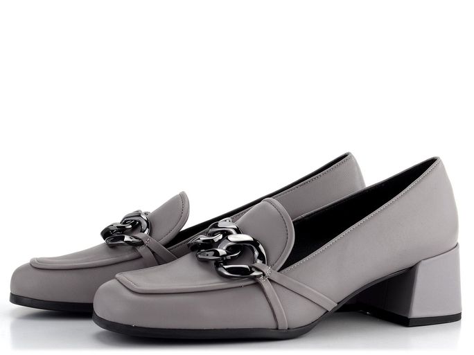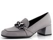 Dámské originálně pojaté mokasíny v šedé barvě, s karé špičkou a širokým stabilním podpatkem.