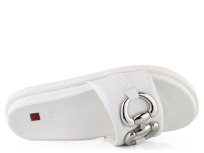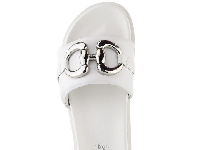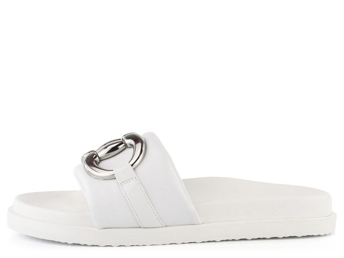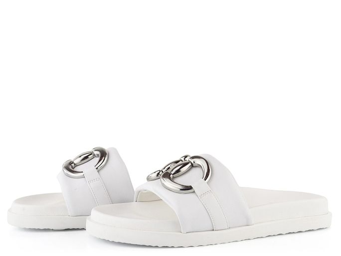 Dámské módní, anatomicky tvarované a pohodlné pantofle v bílé barvě s kovovou ozdobou.
