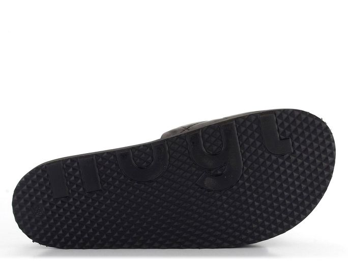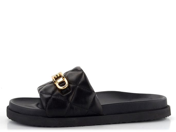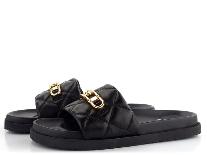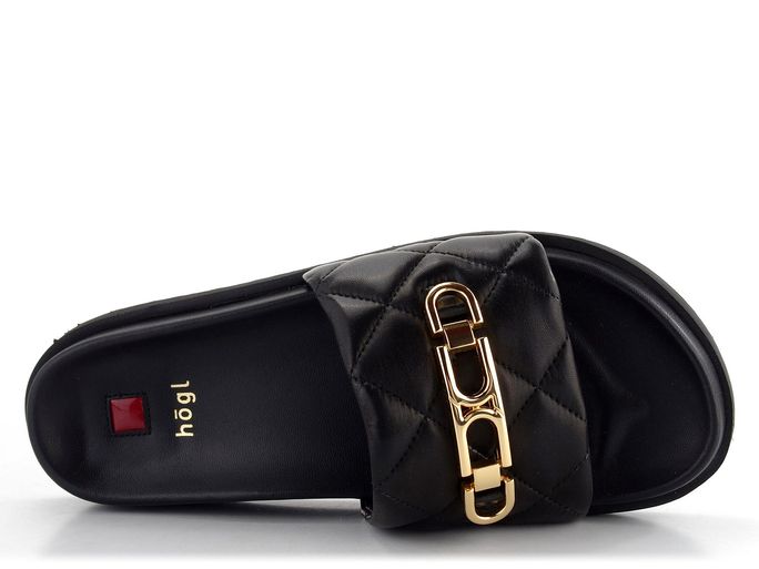 Dámské módní, anatomicky tvarované a velmi pohodlné pantofle v černé barvě s kovovou ozdobou.