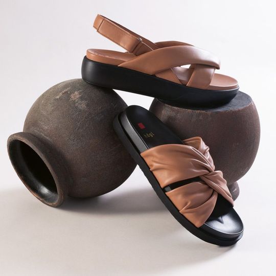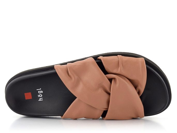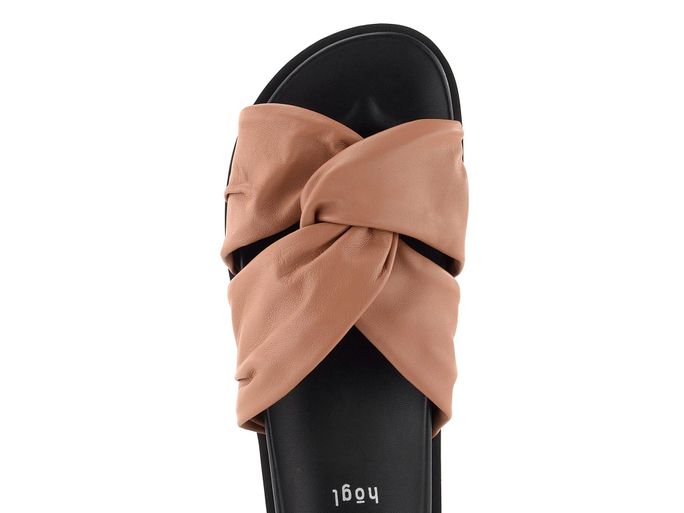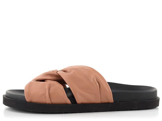 Dámské módní pantofle v mandlově hnědé barvě s kříženými pásky a tvarovanou stélkou.