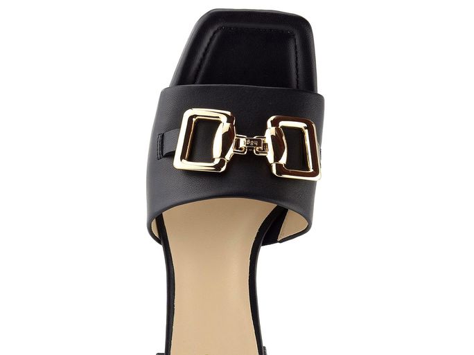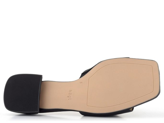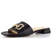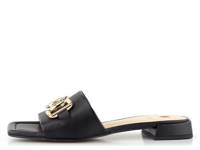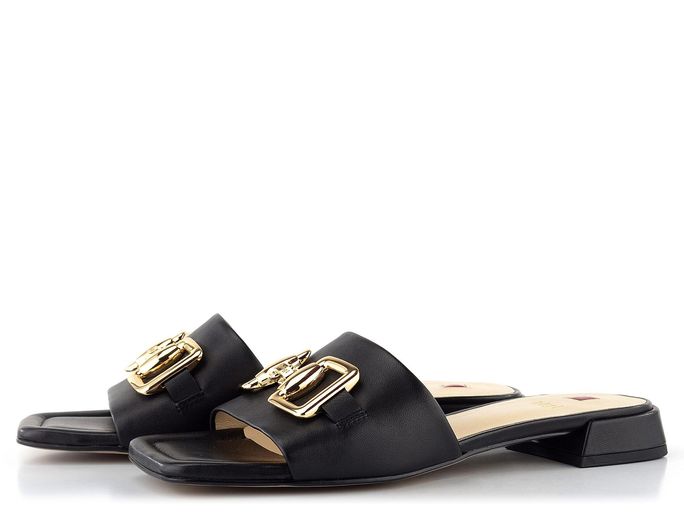 Dámské černé pantofle s kovovou dominantní sponou a s nízkým pohodlným podpatkem.