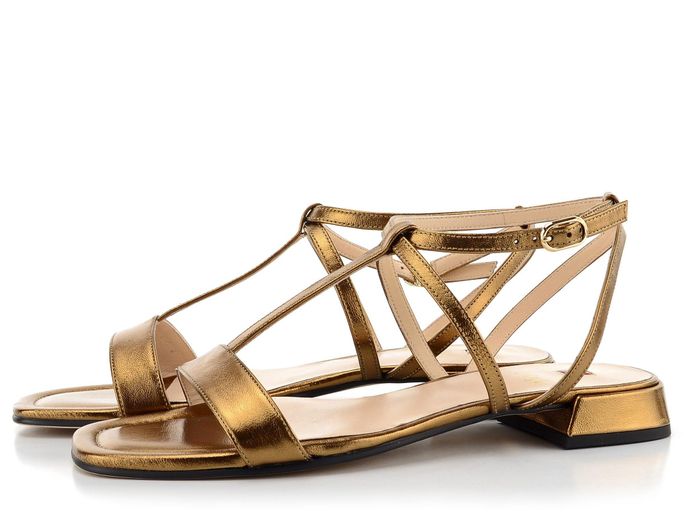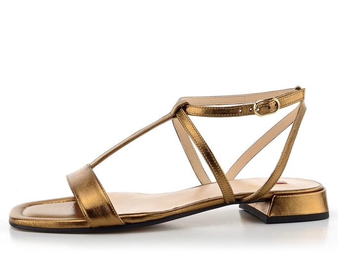 Dámské páskové sandály v bronzové barvě se sponou na vnějším kotníku a potaženým podpatkem.