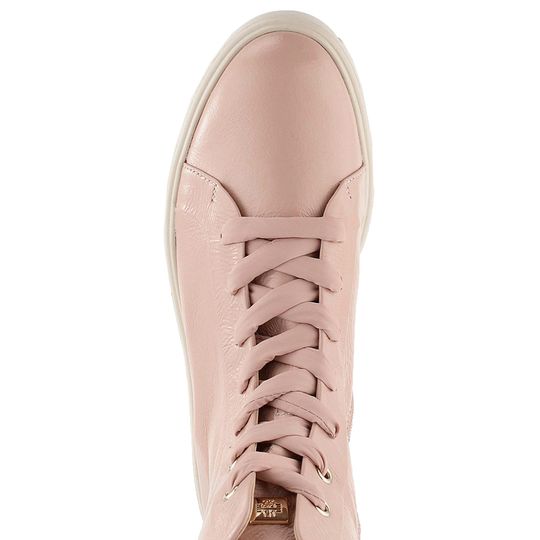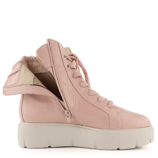 Exkluzivní něžný růžový dámský kotník v městském stylu z lakované prémiové kůže a na vysoké platformě.