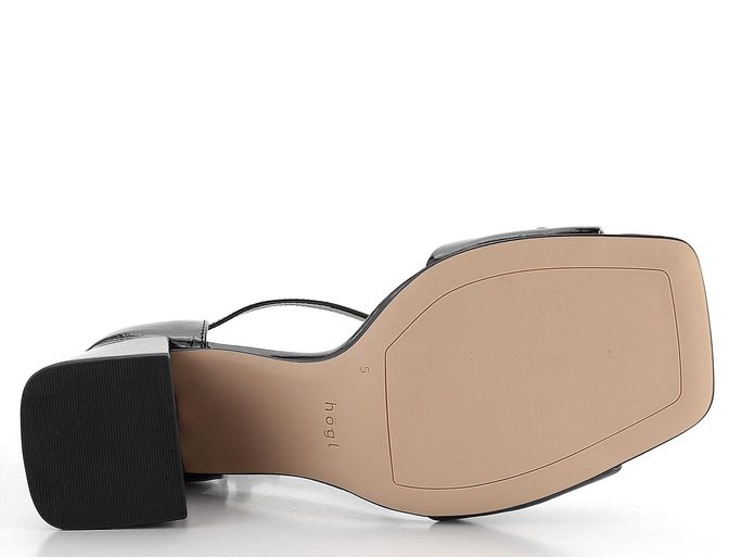 Obohaťte svůj šatník o luxusní dámské sandály na podpatku od značky Högl. Tyto elegantní sandály v černé barvě jsou vyrobeny z jemné lakované kůže, která dodává sofistikovaný vzhled. Střih do karé špičky a ozdobný kovový řetízek na špičce přidávají na exkluzivitě. Pohodlí zajišťuje celokožená podšívka se zabroušeným vnitřním opatkem a lehce měkčená stélka. Vysoký, široký podpatek o výšce 7,2 cm, potažený kůží, poskytuje stabilitu a styl. Pásek kolem nohy s délkovou regulací a všitou pruženkou zaručuje perfektní přizpůsobení. Ideální volba pro formální příležitosti i každodenní nošení ve městě.
