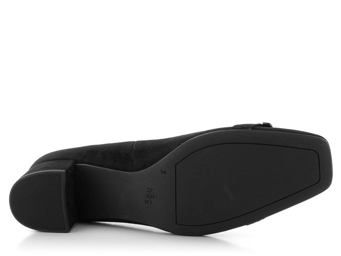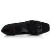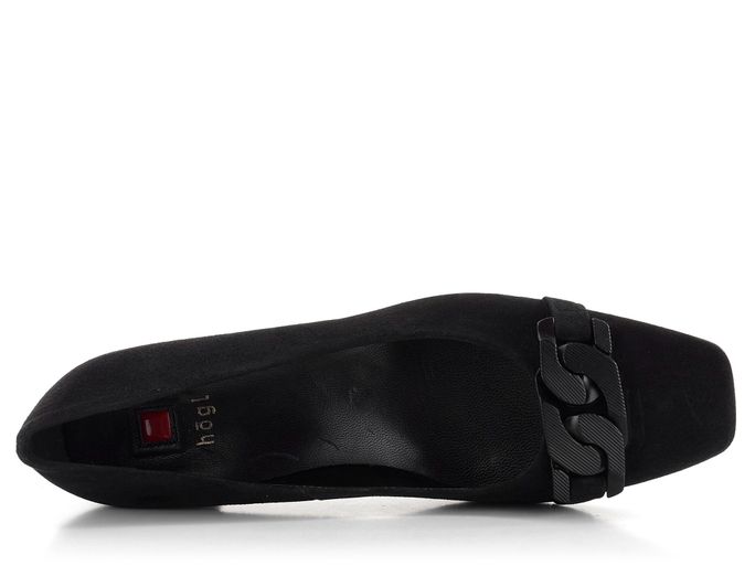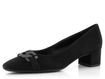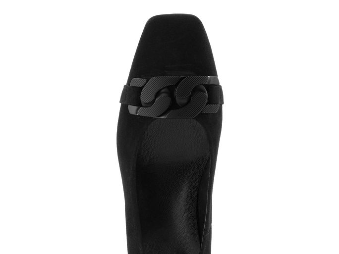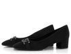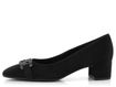 Luxusní dámské semišové lodičky v černé barvě s potaženým podpatkem a módní sponou na špičce.