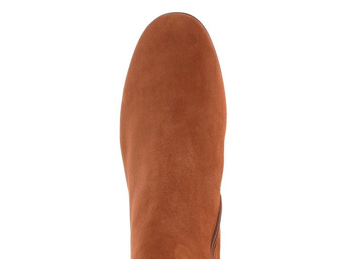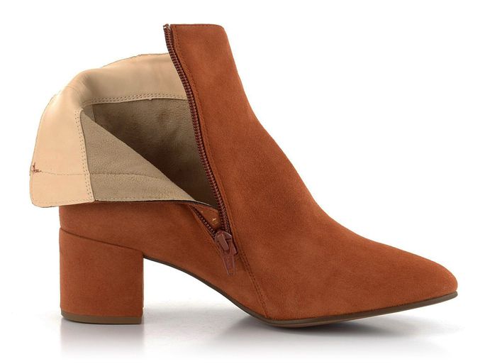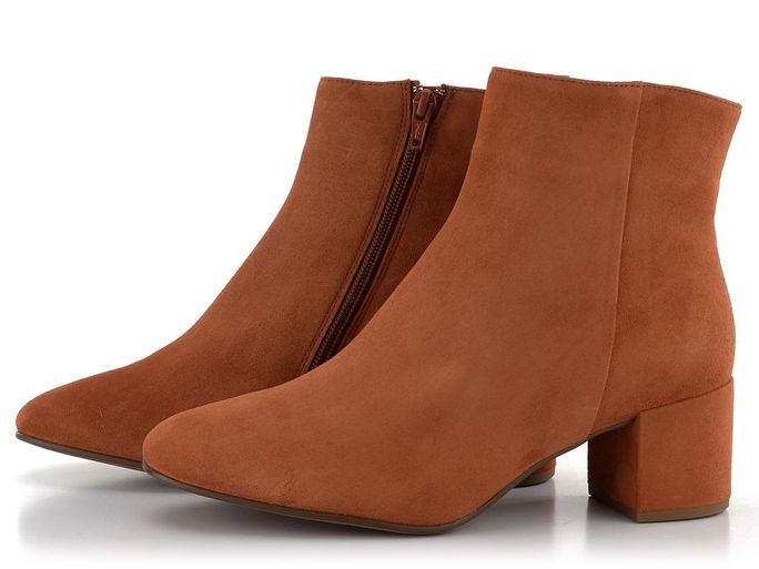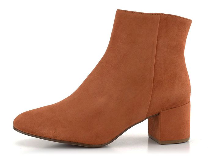 Dámský podzimní elegantní kotník ze semišové kůže v rezavě hnědé barvě a na širokém potaženém podpatku.