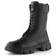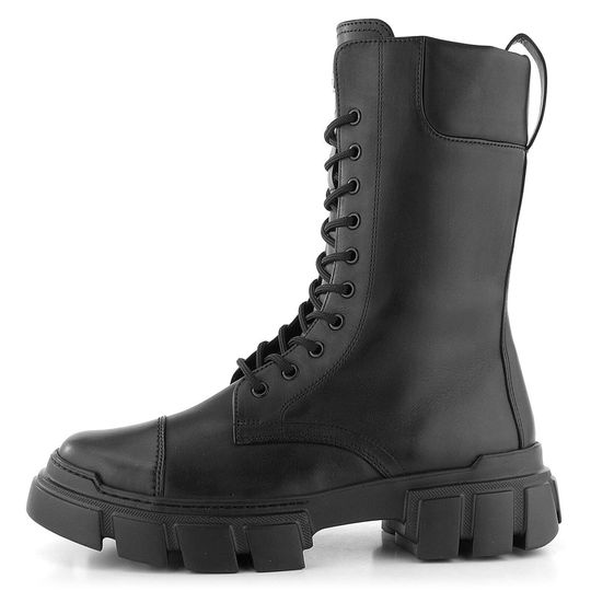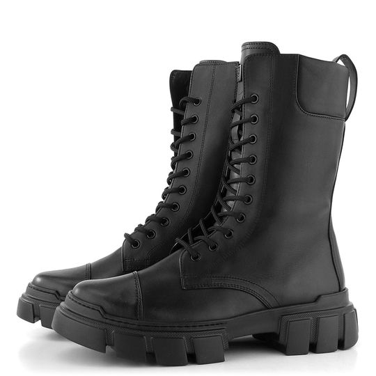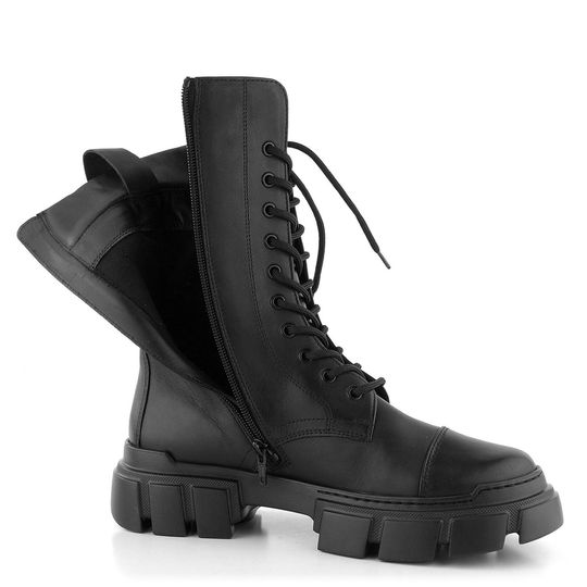 Luxusní dámský kotník z hladké černé kůže, se šněrováním a vyšší podešví s hrubým vzorkem.