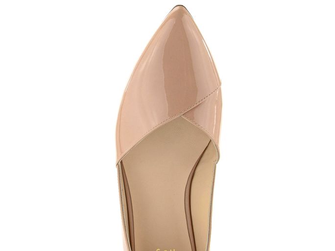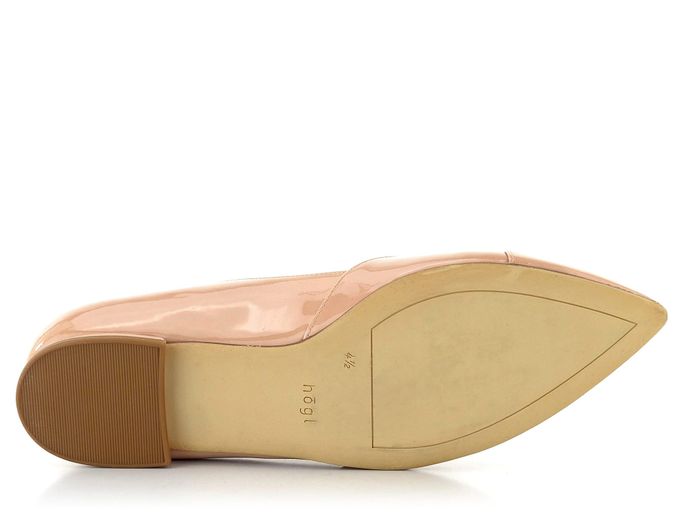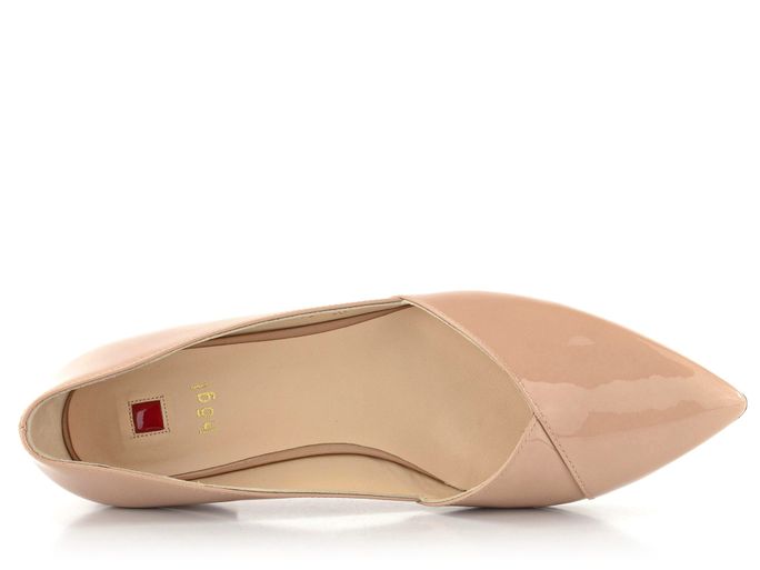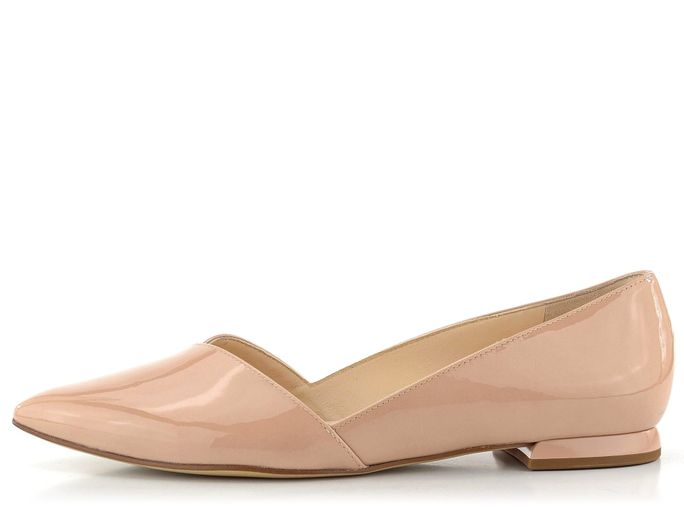 Luxusní dámské špičaté baleríny z lakované kůže v tělové barvě na nízkém potaženém podpatečku.