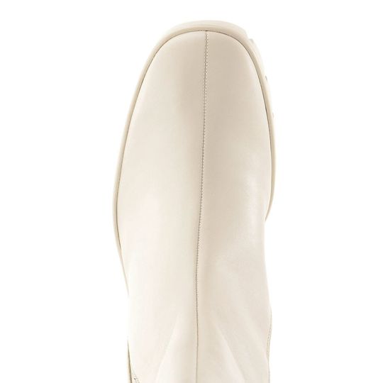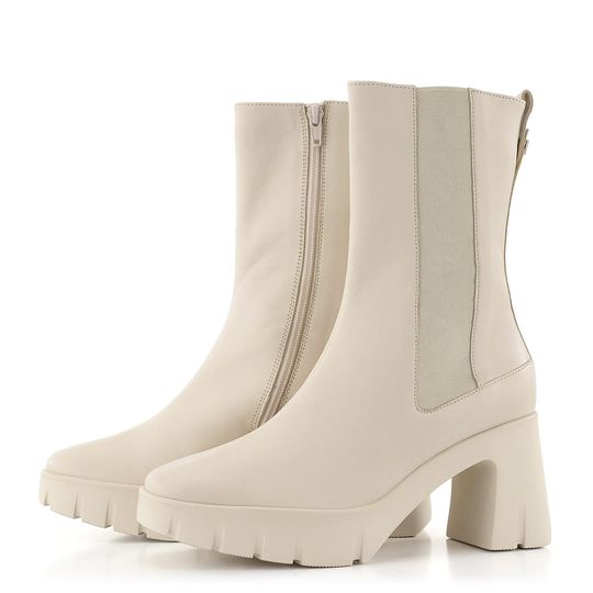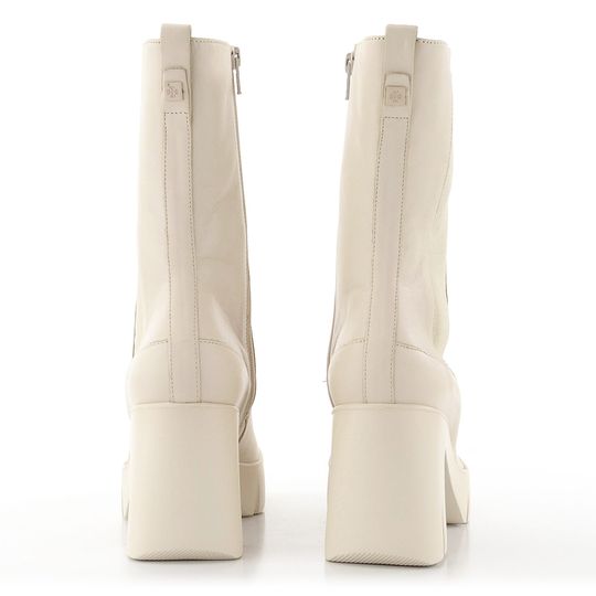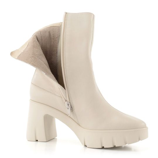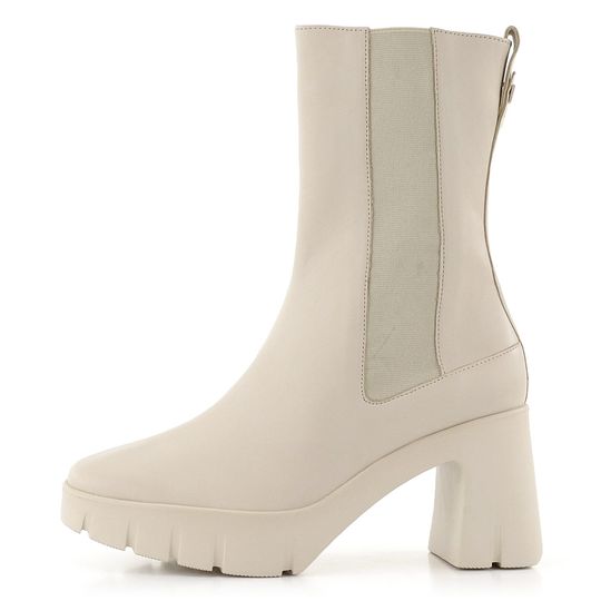 Vyšší dámský nezateplený kotník z hladké světlé kůže, na vysoké platformě s extravagantním podpatkem.