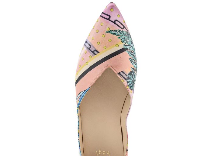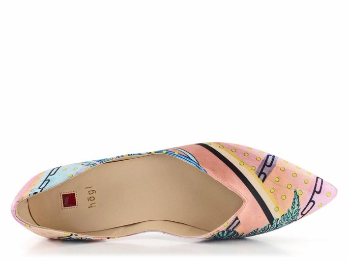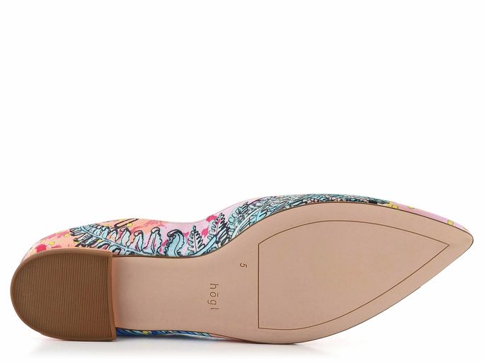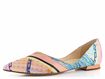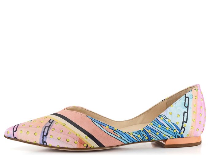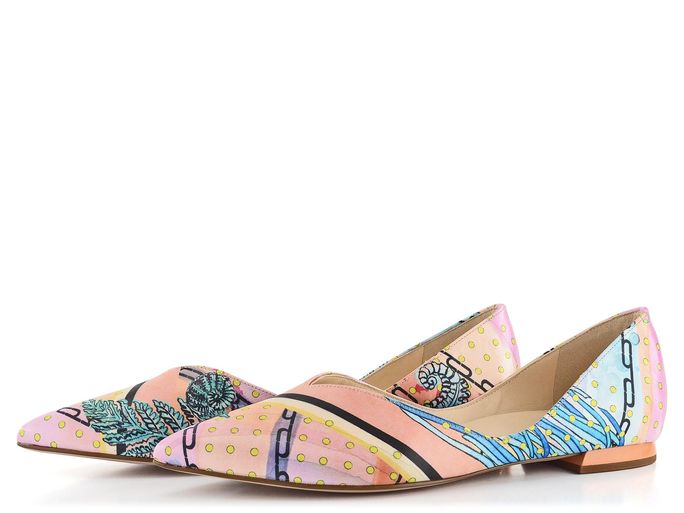 Luxusní dámské špičaté baleríny z hedvábné textilie s barevným vzorem, na nízkém lakovaném podpatečku.