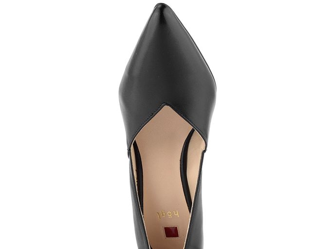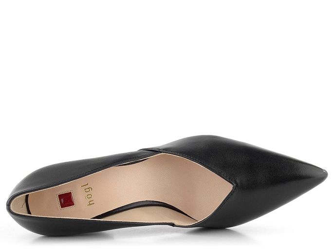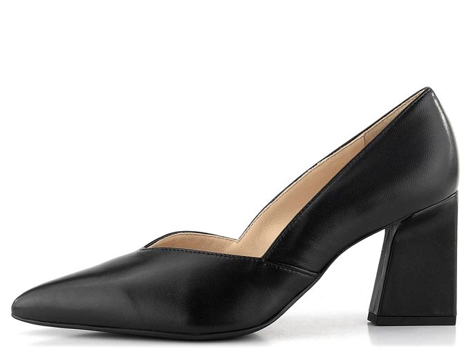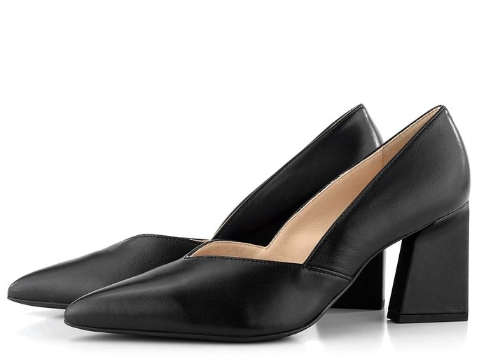 Dámské elegantní lodičky z černé hladké kůže se širším, potaženým podpatkem.