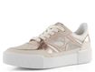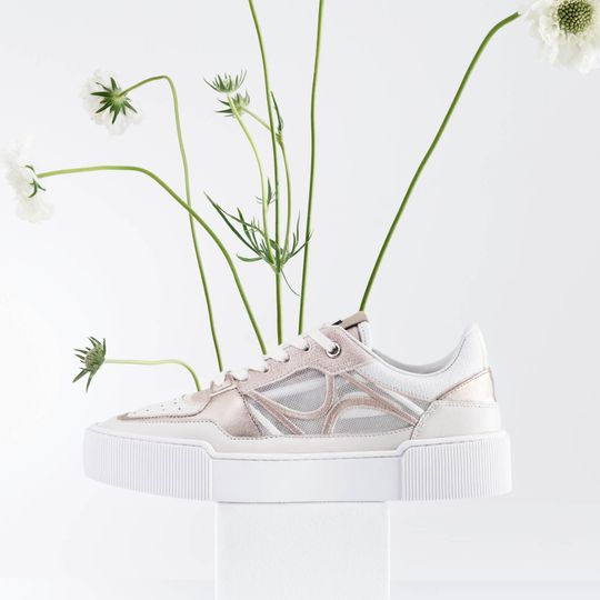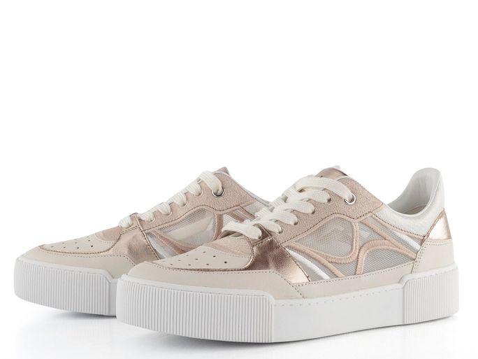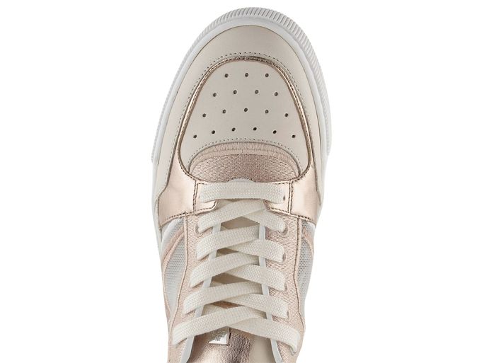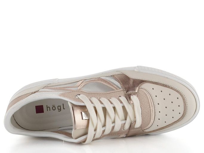 Dámské luxusní tenisky od značky Högl přinášejí kombinaci stylu a pohodlí, kterou ocení každá žena. Tyto boty na šněrování vynikají svým prostorným kulatým střihem a kombinací hladké a metalické kůže s prodyšnou síťovinou na bocích. Příjemná kombinace krémové, světlé béžové, bílé a světlé bronzové barvy dodává botám jedinečný vzhled, který se hodí do města i na lehkou procházku venku. Kožený vnitřek a měkká stélka zajišťují komfort, zatímco vyšší latexová platforma o výšce 3,7 cm přidává na eleganci. Tato obuv je ideální volbou pro ženy, které hledají kvalitu a styl bez kompromisů.