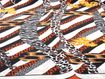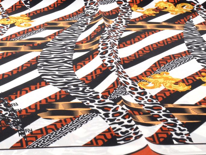 Luxusní hedvábný šátek se zebrovaným a leopardím vzorem v pěkné kombinaci oranžové, žluté, černé a bílé barvy.