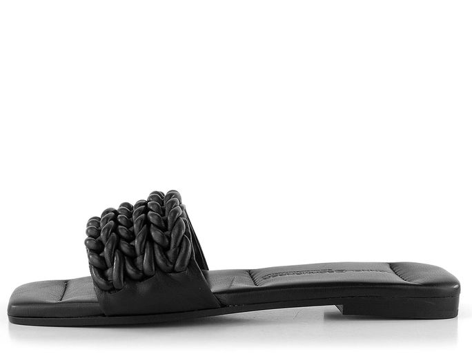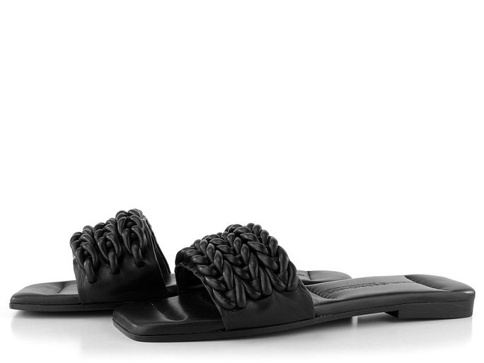 Dámské luxusní kožené pantofle v černém provedení, zdobené proplétanými pásky.