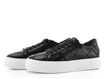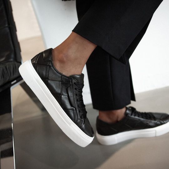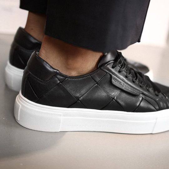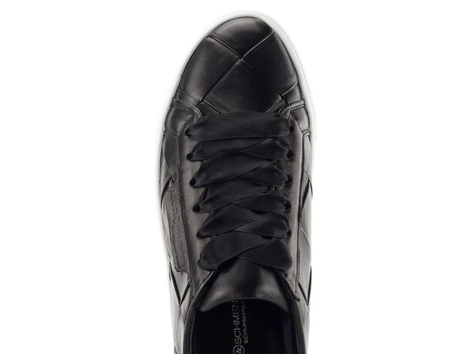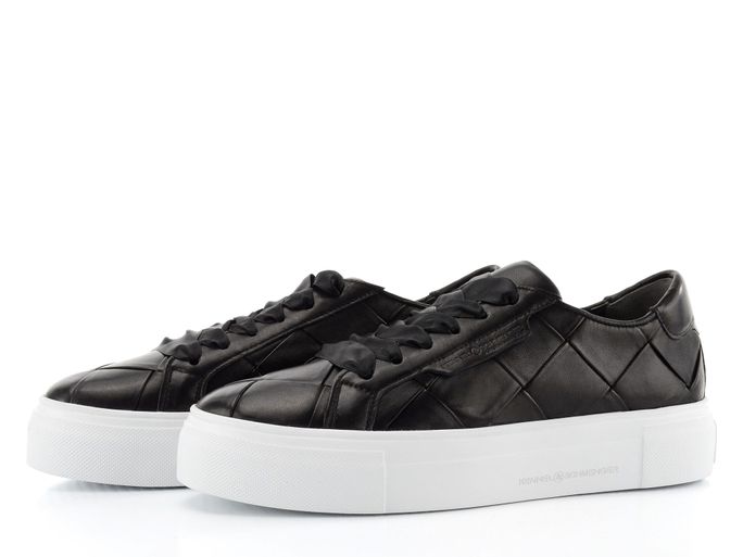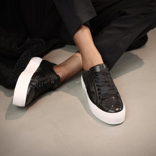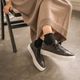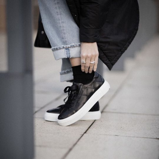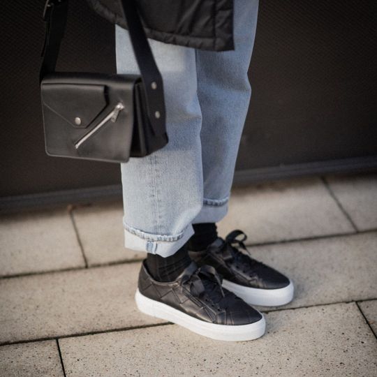 Dámské kožené tenisky na vysoké, rovné podešvi jsou v černém provedení s překládanou kůží.