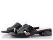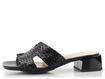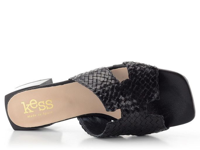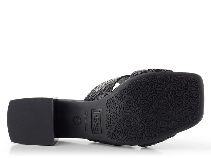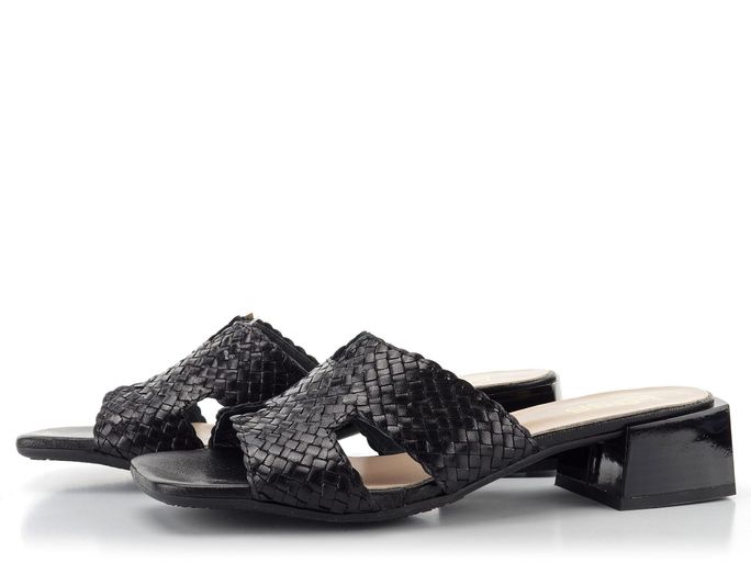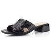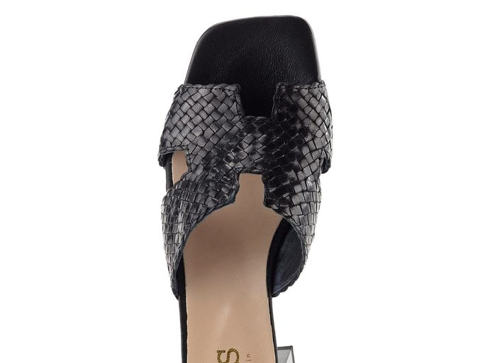 Luxusní dámské pantofle ze splétané kůže v černé barvě s originálně tvarovaným podpatkem.