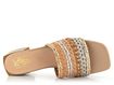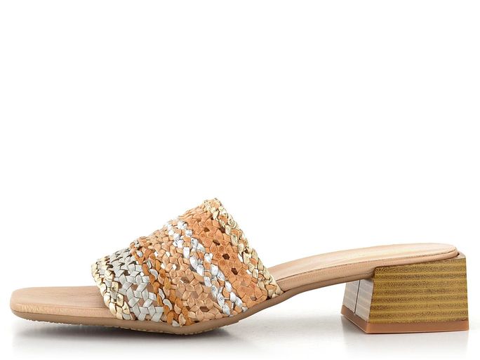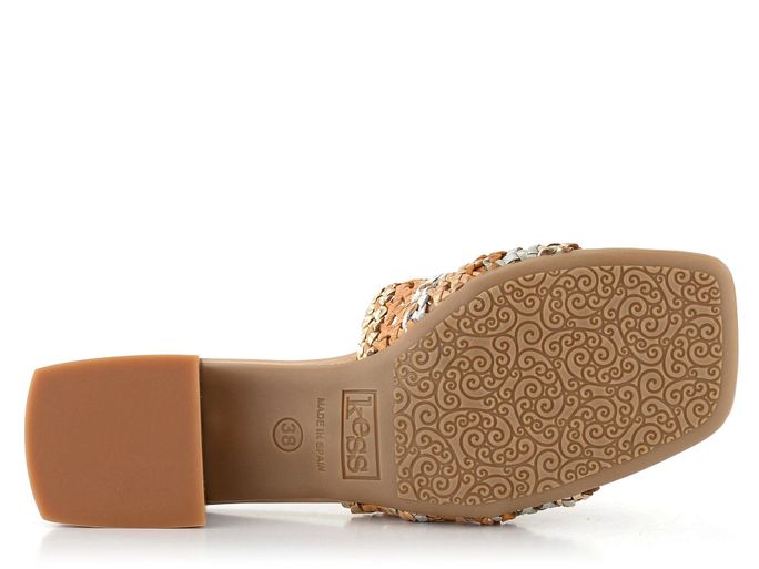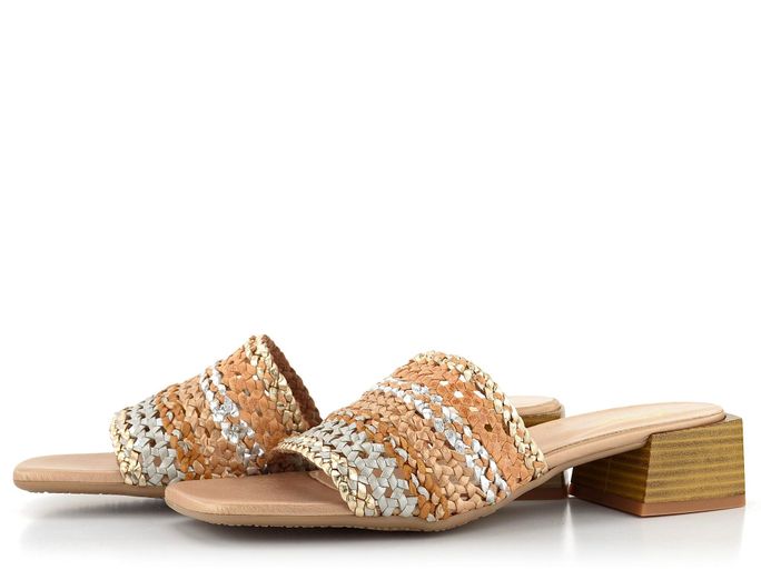 Luxusní dámské pantofle od značky KESS představují skvělou volbu pro jarní a letní sezónu. Tyto páskové boty vynikají svým módním hranatým (karé) střihem a jsou vyrobeny z ručně proplétané kůže, což zaručuje jejich jedinečnost a kvalitu. Barevná kombinace béžové, zlaté a stříbrné dodává pantoflím elegantní a moderní vzhled. Široký pásek je z rubové strany bez podšívky, což zvyšuje komfort při nošení. Kožená stélka s vyměkčením ve špičce a pod patou poskytuje maximální pohodlí. Latexová podešev a trendy hranatý podpatek o výšce 3,7 cm zajišťují stabilitu a styl. Tyto pantofle jsou ideální volbou pro ženy, které hledají kombinaci luxusu, pohodlí a moderního designu.