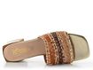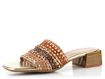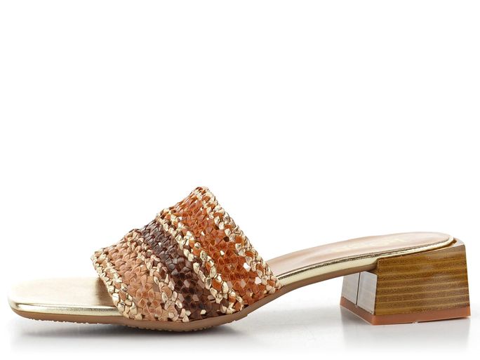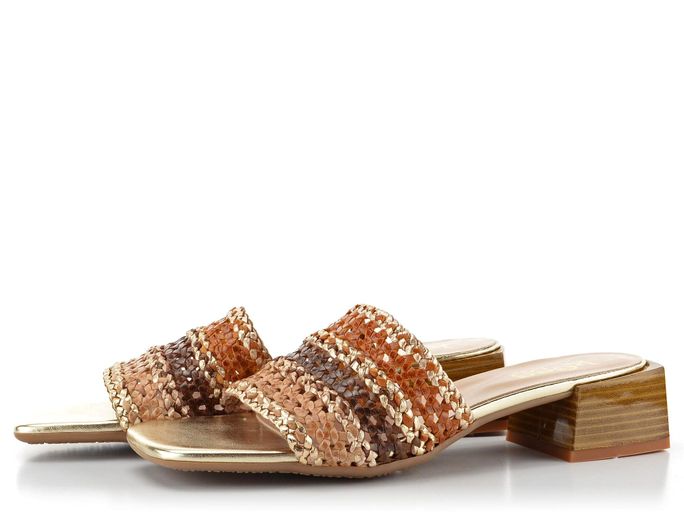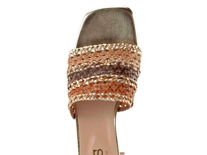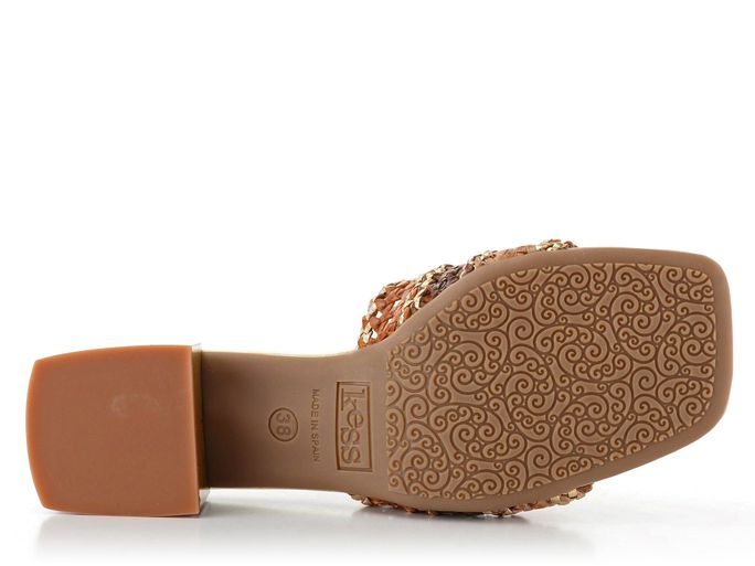 Luxusní dámské pantofle od značky KESS představují spojení autentického designu a trvalé kvality. Jsou ideální volbou pro jarní a letní sezónu. Tyto módní pantofle se vyznačují hranatým (karé) střihem a jsou vyrobeny z proplétané kůže v odstínech hnědé, béžové a zlaté barvy. Díky širokému pásku, který je z rubové strany bez podšívky, nabízí vysoký komfort nošení. Kožená stélka s vyměkčením ve špičce a pod patou zajišťuje pohodlí při každém kroku. Latexová podešev a trendy hranatý podpatek s výškou 3,7 cm dodávají pantoflím moderní vzhled. Tyto pantofle jsou skvělou volbou pro každodenní nošení do města, do kanceláře nebo na lehkou procházku.