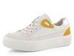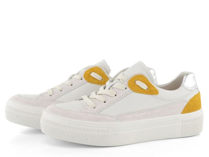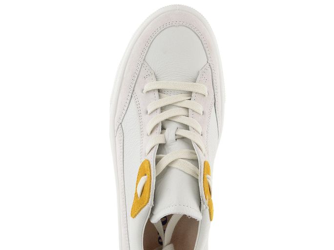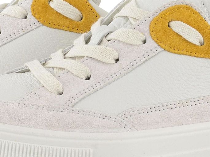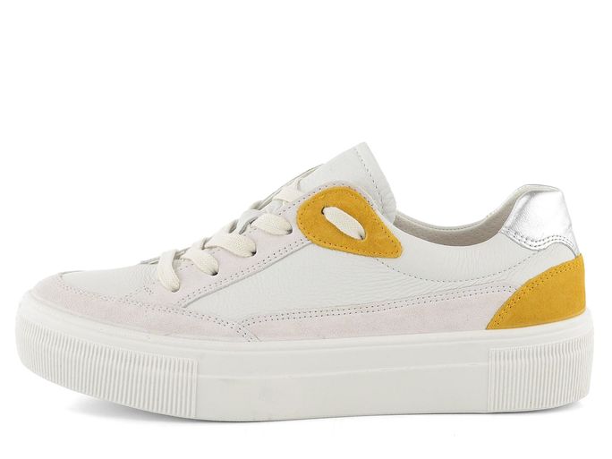 Barva je odražená bílá s žlutými a stříbrnými doplňky, což dodává botám svěží a trendy vzhled. Komfort zajišťuje vyměkčený lem, jazyk a špička, zatímco vnitřní podšívka kombinuje kůži a textílii. Tenisky mají také tvarovanou vyjímatelnou stélku a vysokou platformu s hrubším vzorkem pro lepší stabilitu.