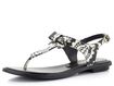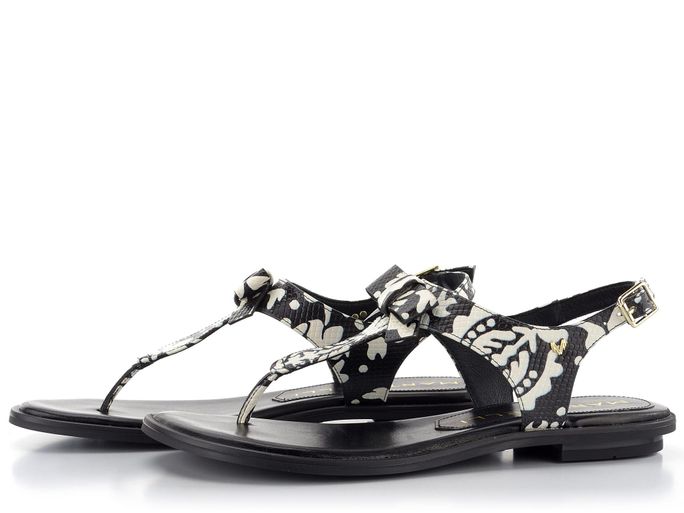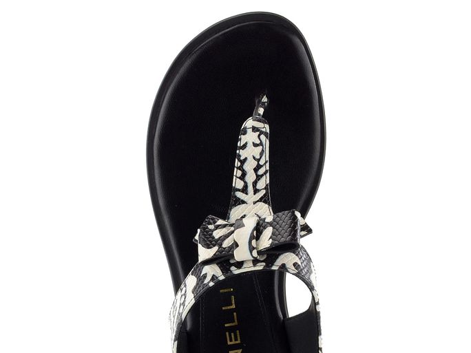 Dámské sandály z hadinkové kůže v černo-bílém provedení a s páskem mezi prsty.