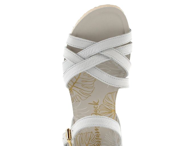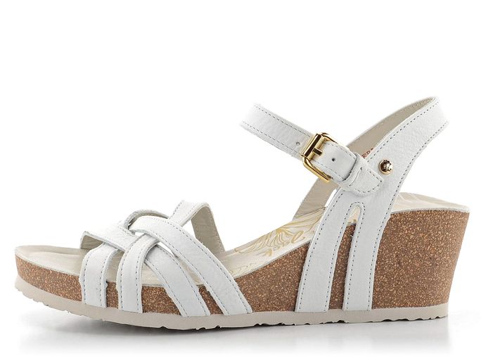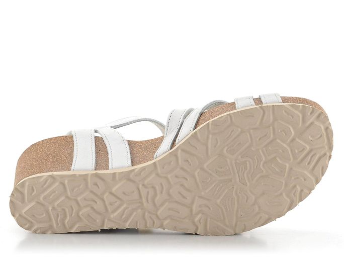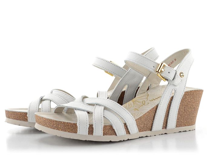 Dámské sandály s korkovou platformou a klínkem s koženými pásky v bílé odražené barvě.