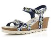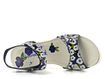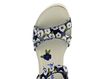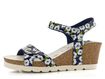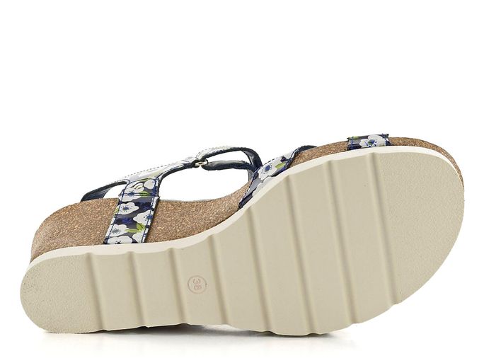 Dámské letní sandály v odstínu švestkově modré barvy se vzorem bílých květin a na pohodlném korkovém klínu.
