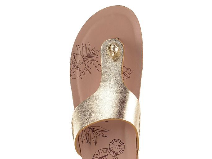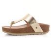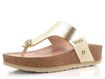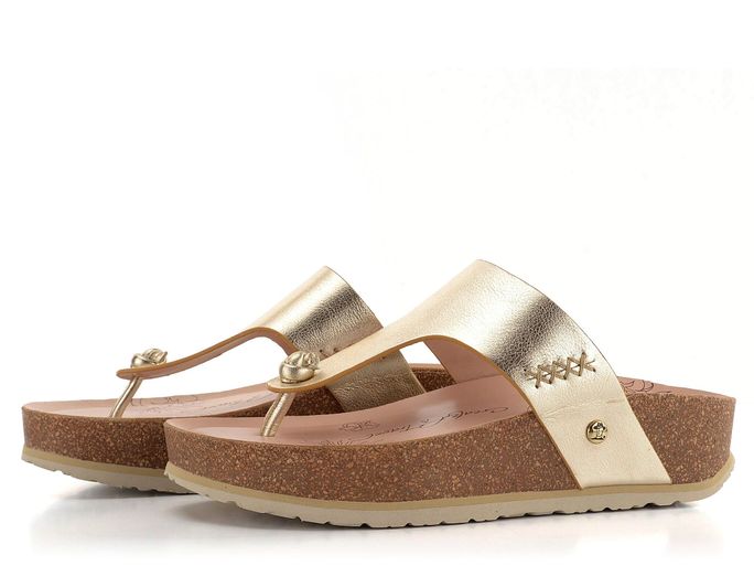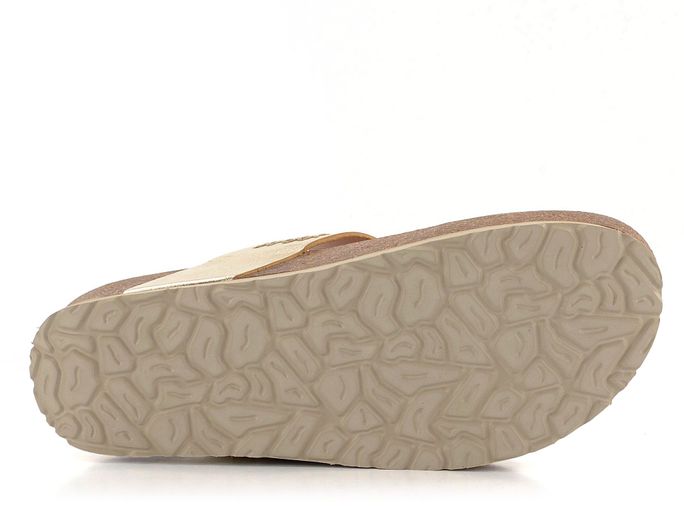 Dámské kožené žabky/pantofle v platinové barvě s metalickým leskem na vyšší korkové platformě.