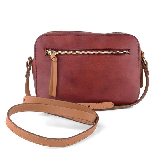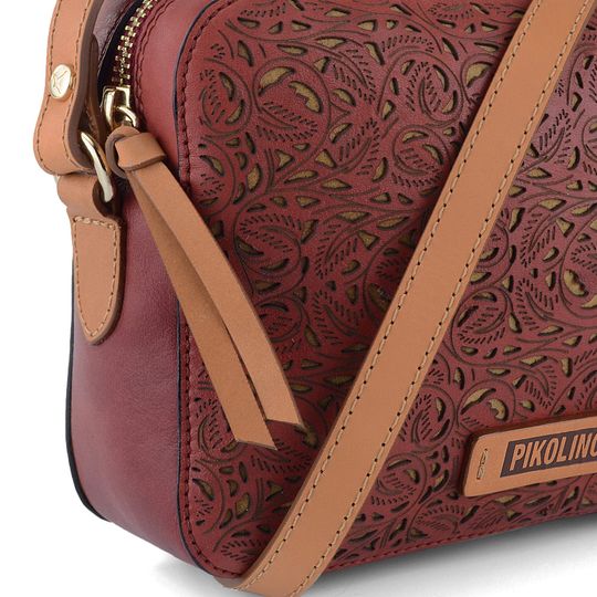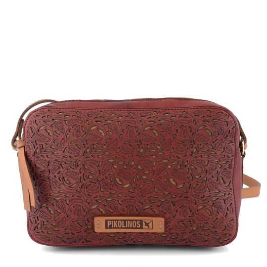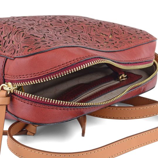 Dámská módní kabelka v červenovínové barvě s ozdobným prořezávaným motivem na přední straně.