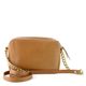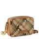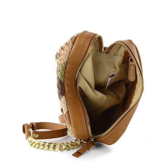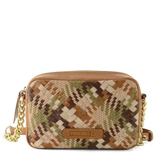 Luxusní dámská crossbody kabelka z přírodní kůže se zdobenou přední stranou se vzájemně propletenými barevnými pásečky.
