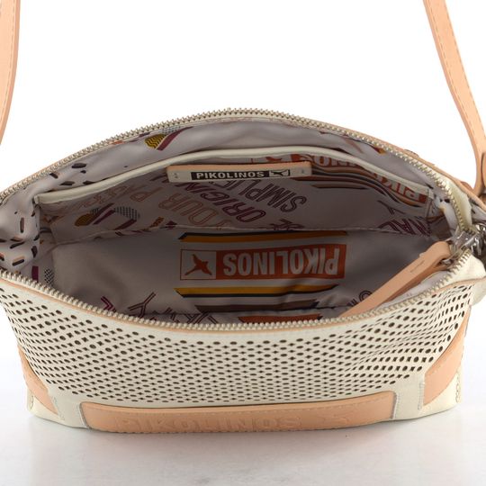 Představujeme luxusní koženou crossbody kabelku od značky Pikolinos, která je ideální volbou pro každodenní nošení. Její obdélníkový tvar a optimální velikost umožňují pohodlné uschování všech nezbytností. Kabelka je vyrobena z hladké a poddajné kůže v jemné smetanové barvě s béžovými doplňky, což jí dodává elegantní vzhled. Kování a zipy ve stříbrné barvě podtrhují její sofistikovanost. Praktické detaily zahrnují perforovaný vzor a ozdobný pásek s názvem značky na přední straně, zatímco zadní zipová kapsička je ideální pro rychlý přístup k drobnostem. Uvnitř najdete barevnou podšívku s vnitřní výbavou: dvě otevřené přihrádky a větší kapsičku na kovový druk. Kožený ramenní pásek s variabilní délkou (108 cm ± 6 cm) zaručuje pohodlné nošení. Rozměry kabelky jsou šířka 31 cm, výška 17 cm a hloubka 10 cm.