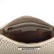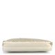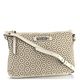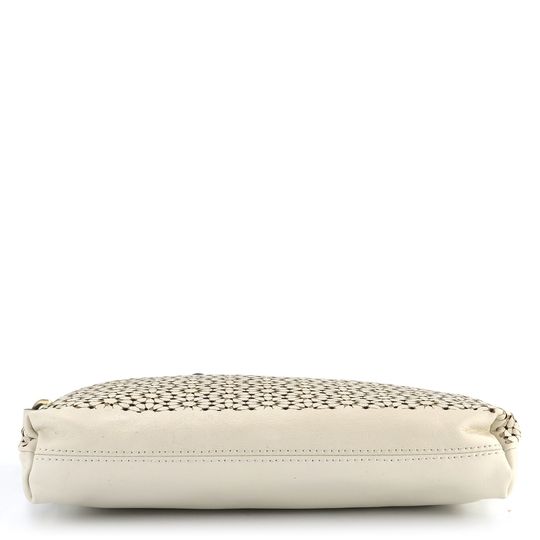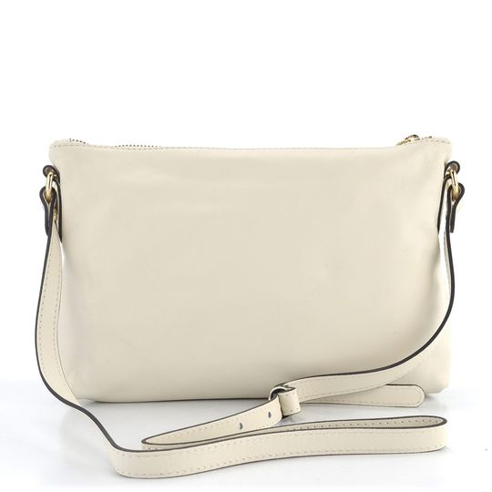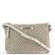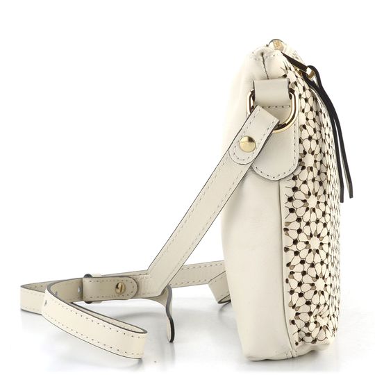 Menší dámská crossbody kabelka v krémové barvě, s prořezávaným vzorem na přední straně.