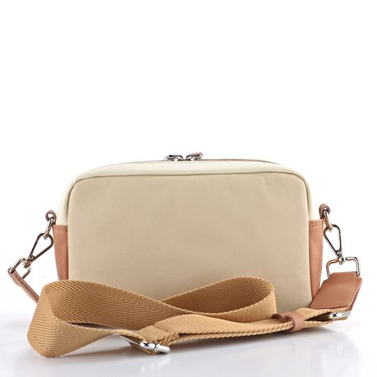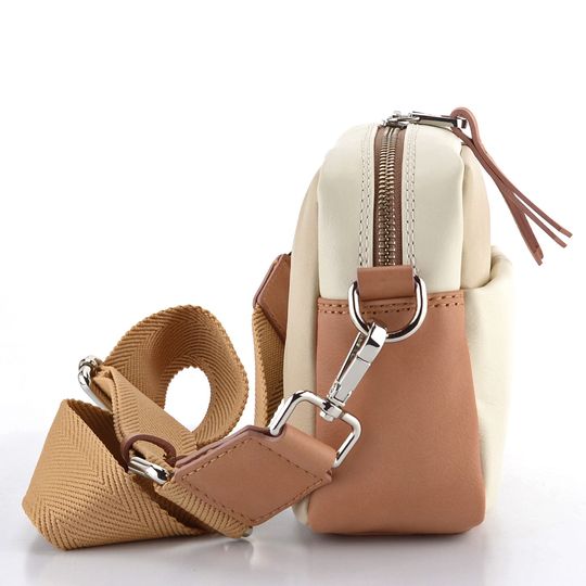 Luxusní kožená crossbody kabelka od značky Pikolinos je ideální volbou pro každodenní nošení. Díky svému obdélníkovému tvaru a optimální velikosti snadno pojme všechny vaše nezbytnosti. Kabelka je vyrobena z hladké a poddajné kůže v kombinaci krémové, světle béžové a hnědé - mandlové barvy, což z ní činí stylový doplněk pro každou příležitost. Kování a zipy ve stříbrné barvě dodávají kabelce elegantní vzhled.