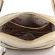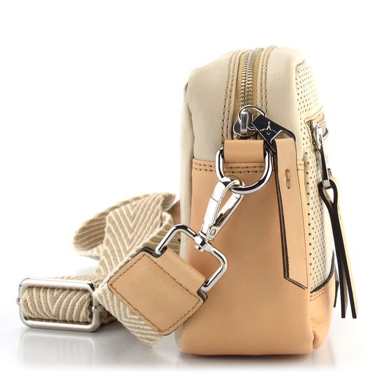 Na přední straně najdete pohotovostní zipovou kapsičku, zatímco hlavní kapsa je uzavíratelná na kovový zip. Uvnitř kabelky se nachází barevná podšívka a dvě otevřené přihrádky pro lepší organizaci. Kabelka je vybavena širokým ramenním popruhem z kombinace kůže a textilie, který lze odepnout a nastavit na délku od 63 cm do 103 cm.