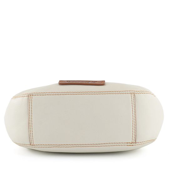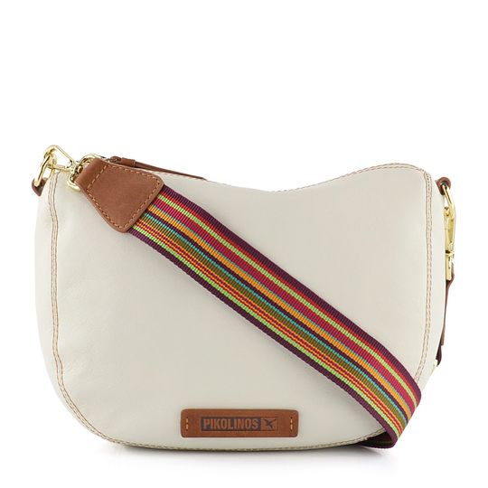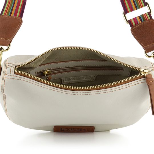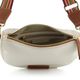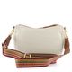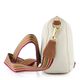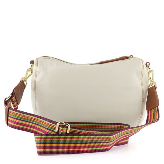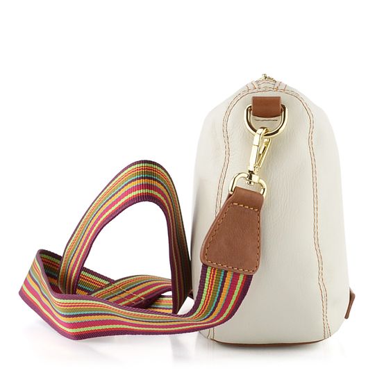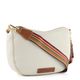 Originální dámská crossbody kabelka v krémové barvě a menším střihu, s výrazným ramenním popruhem.