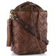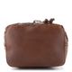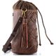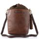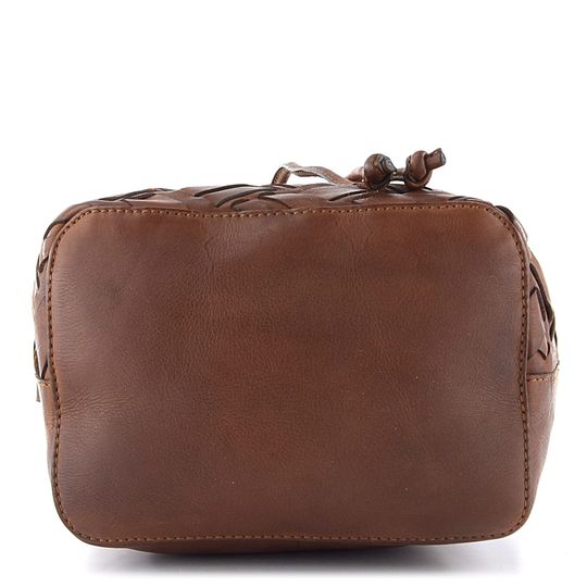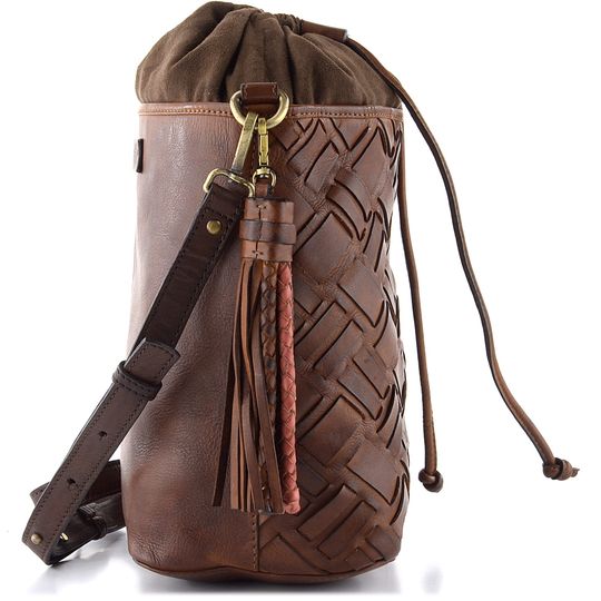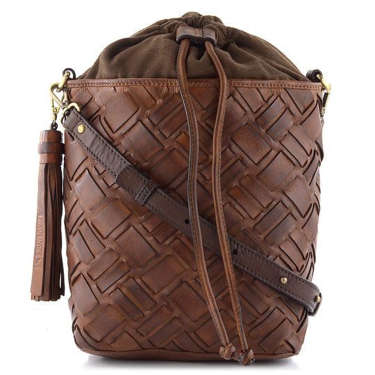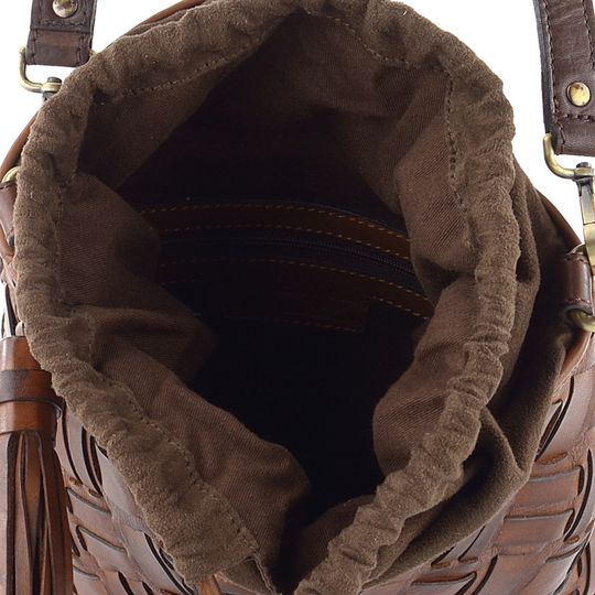 Originální dámská kožená kabelka se stahováním do vaku, v tmavší hnědé barvě a s proplétanými pásečky na přední straně.