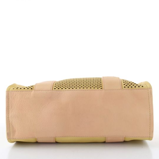 Luxusní dámská kožená kabelka v pastelové žluté barvě s odepínatelným crossbody popruhem a prořezávaným vzorem na přední straně.