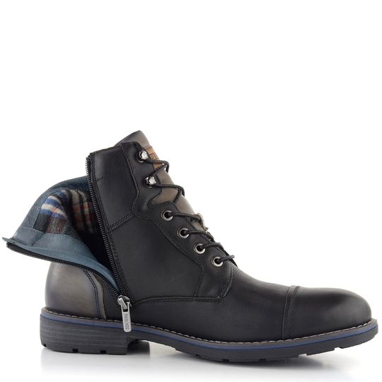 Elegantní pánský kožený kotník v černé barvě se šněrováním, postranním zipem a vyjímatelnou stélkou.