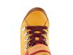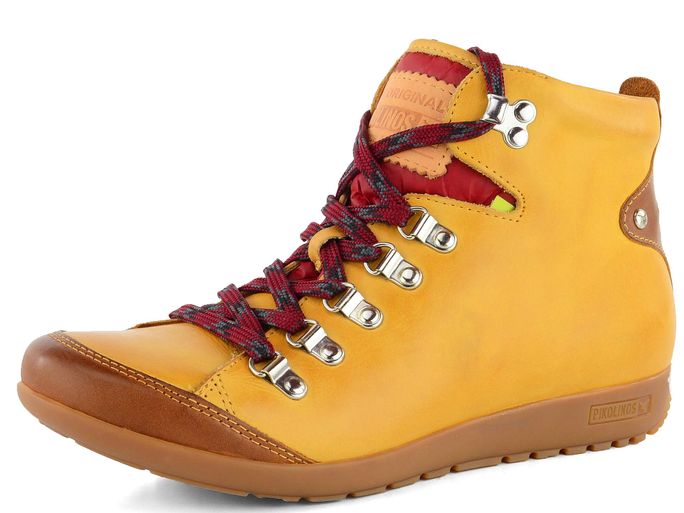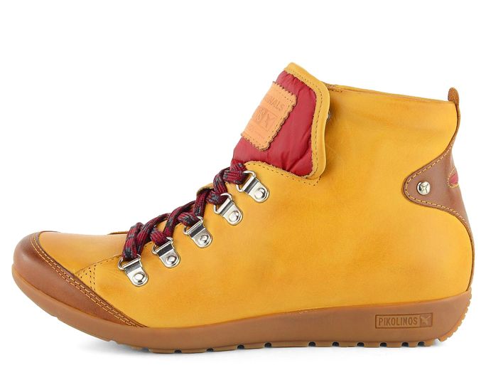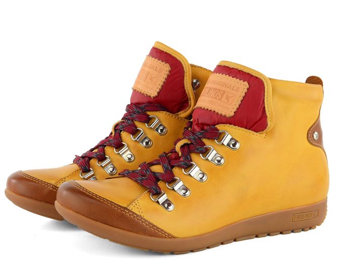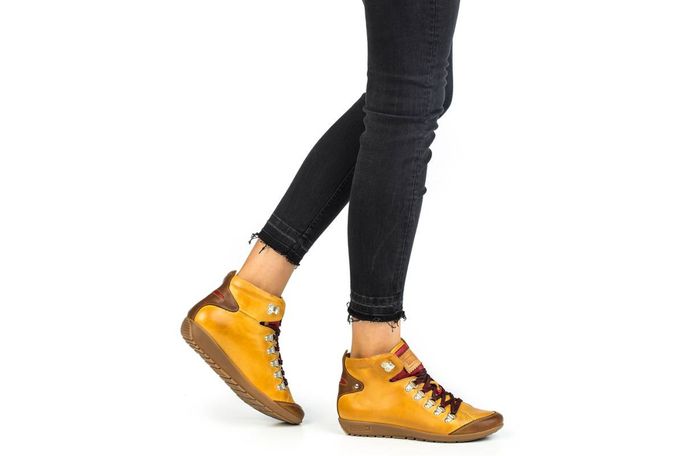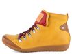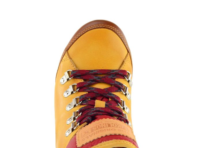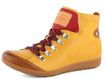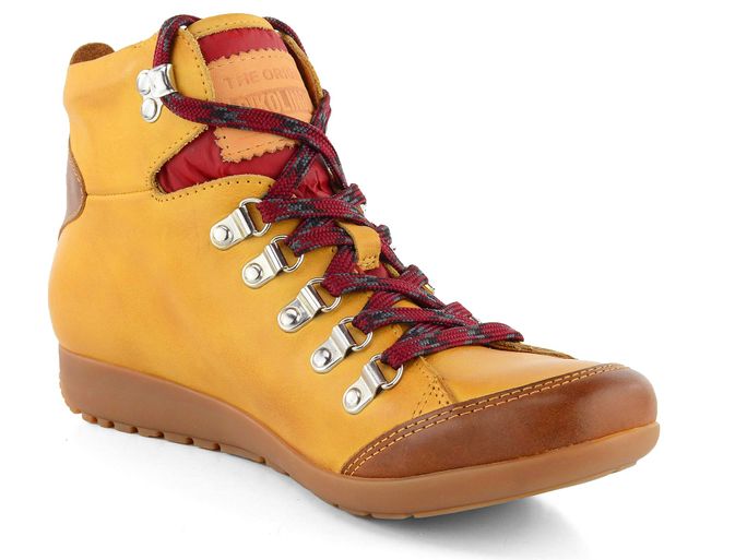 Dámský pohodlný ležérní kotník v kombinaci okrově žluté, oříškově hnědé a vínové barvy.