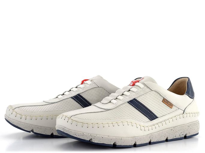 Zažijte pohodlí a styl s pánskými polobotkami značky Pikolinos. Tyto boty jsou ideální volbou pro jaro a léto, ať už se chystáte do města, do kanceláře nebo na lehkou procházku. Díky svému prozouvacímu designu s pružinkami místo šněrování se snadno obouvají a přizpůsobí se každé noze. Svršek z hladké kůže v jemné krémově šedé barvě s tmavě modrými doplňky dodává botám elegantní vzhled, zatímco jemný vyražený vzor na bocích a ozdobné prošívání zajišťují jedinečný design.