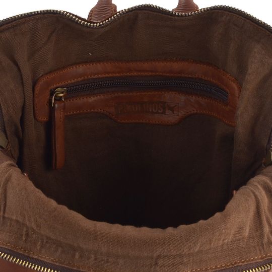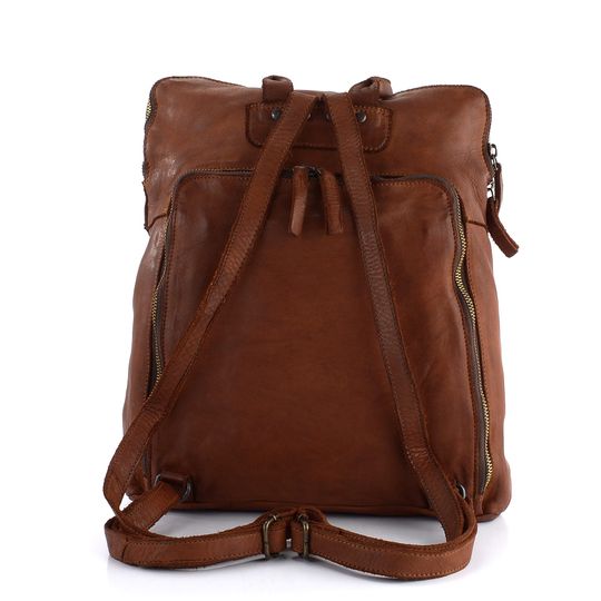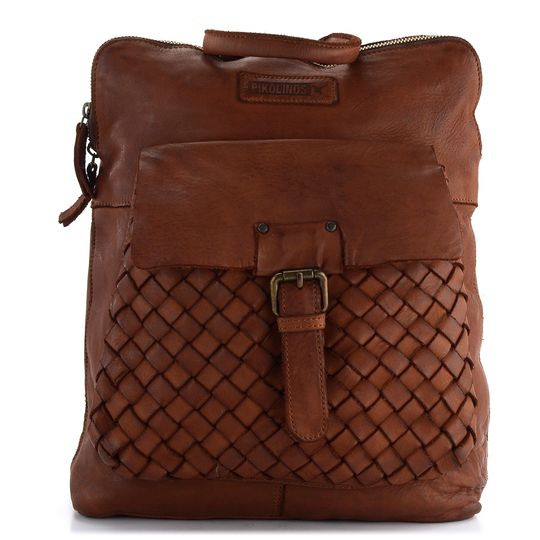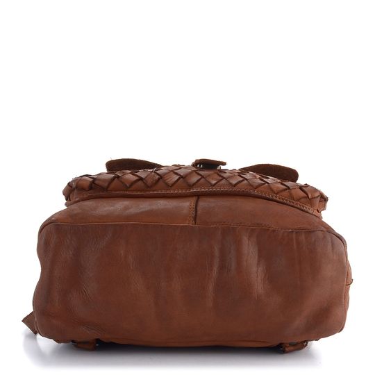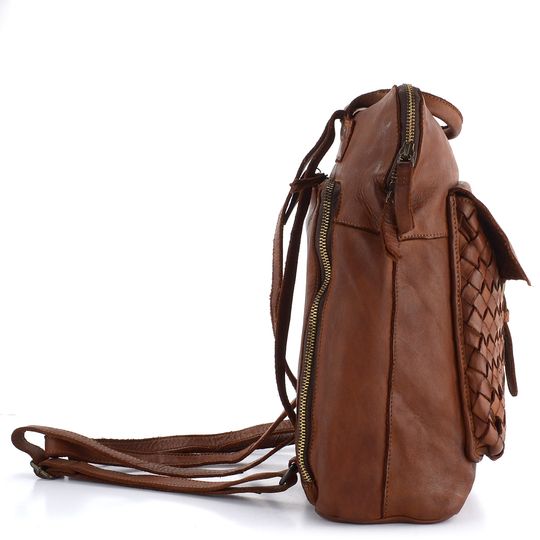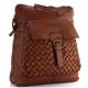 Luxusní dámský kožený batoh v hnědé barvě s proplétanou přední kapsou.