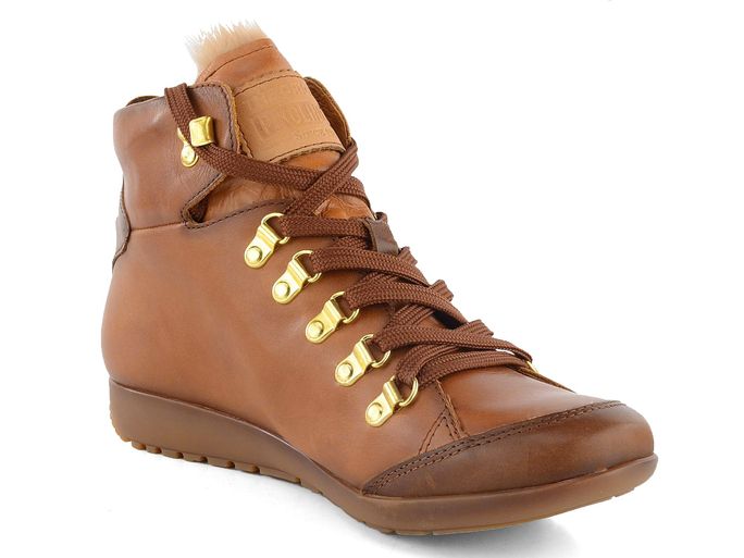 Dámský pohodlný ležérní kotník v přírodní hnědé barvě s ozdobnou labutěnkou a kontrastními šněrovadly.