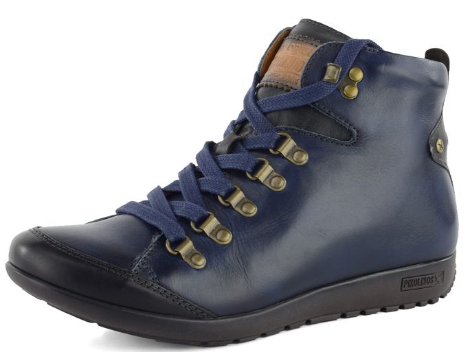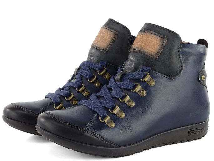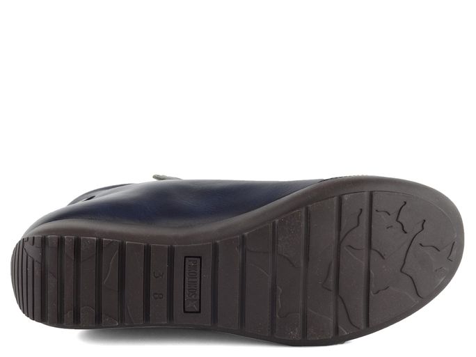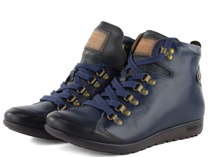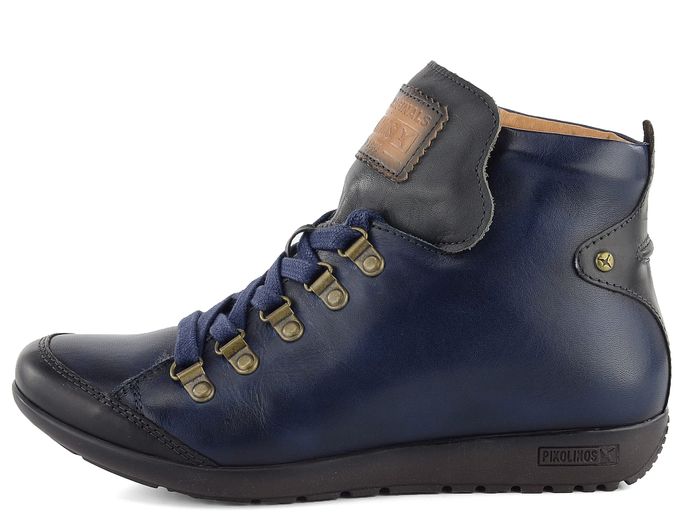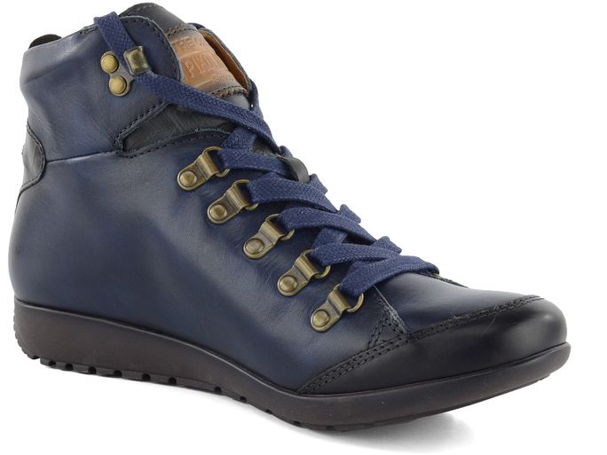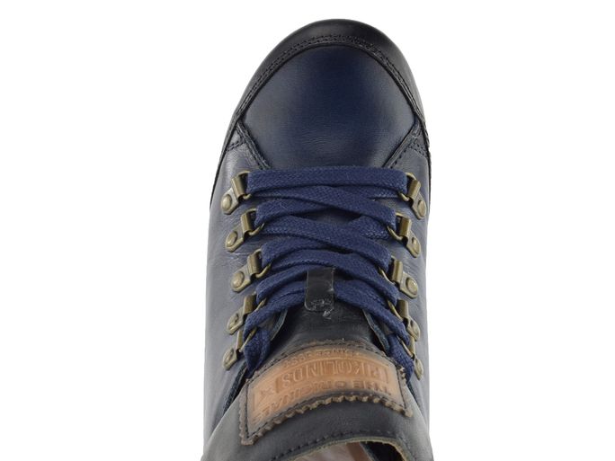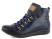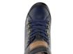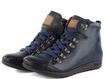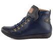 Dámský pohodlný ležérní kotník v temně modré barvě v kombinaci s šedou a mosaznými kovovými doplňky.
