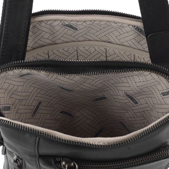 Praktické detaily, jako jsou dvě zipové kapsy na přední straně a zipová kapsa na zadní straně, nabízí dostatek úložného prostoru. Hlavní kapsy, uzavíratelné na zip, obsahují polstrovanou přihrádku na tablet a další přihrádky pro vaše cennosti. Odepínatelný kožený popruh s regulací délky (70–120 cm) zajišťuje pohodlné nošení.