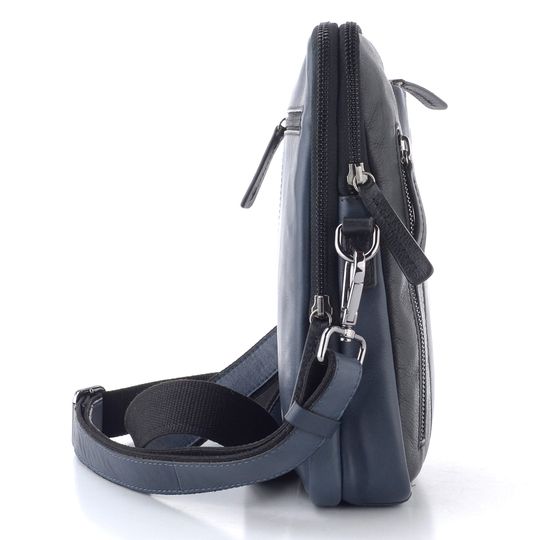Pánská kožená kabela v modro-černé barevné kombinaci s praktickými kapsičkami a nastavitelným popruhem.