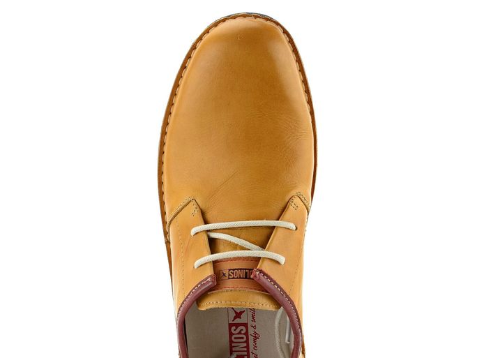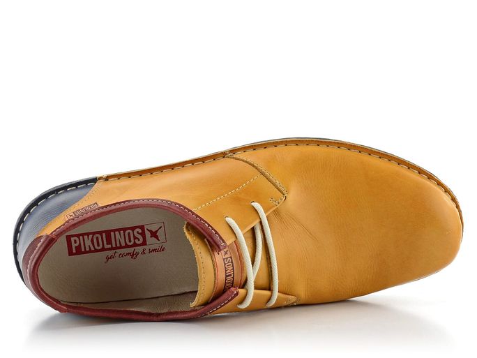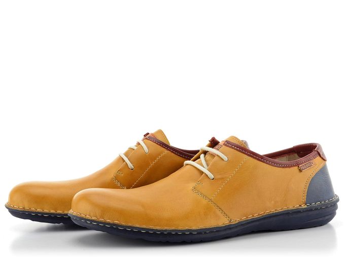 Pánské pohodlné šněrovací polobotky v medově žluté barvě s kontrastními doplňky.