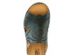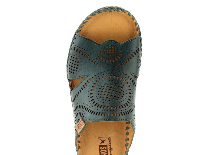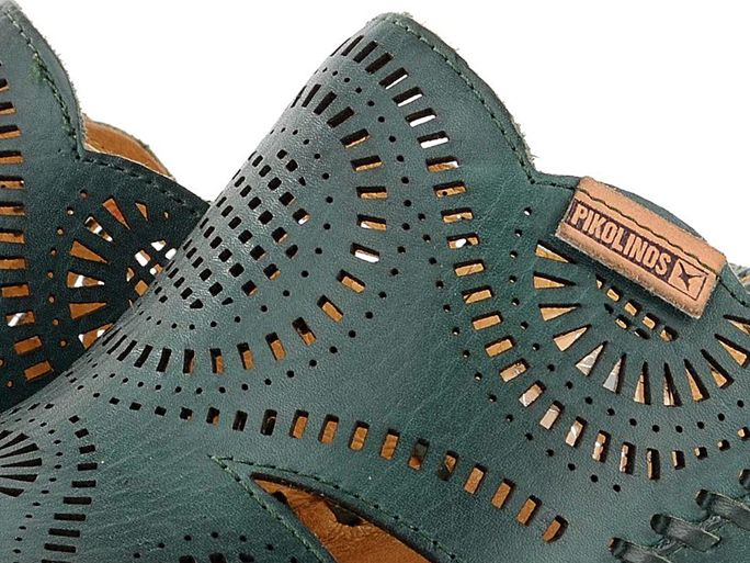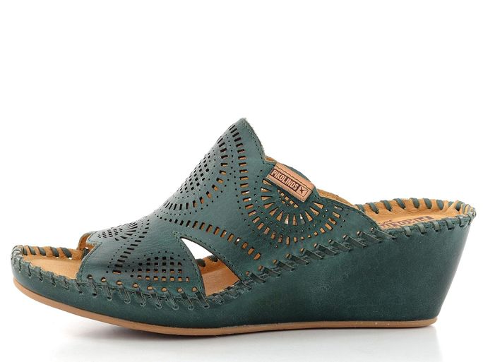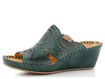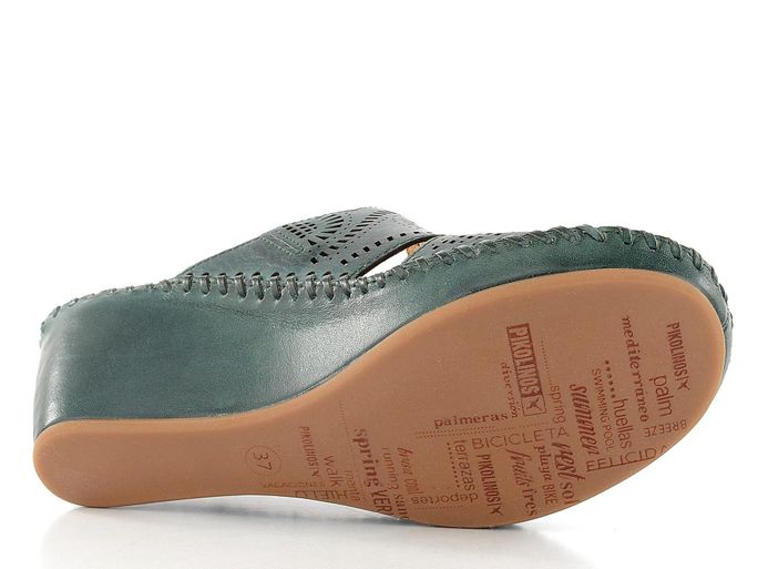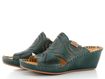 Dámské pantofle na vyšším klínku ve smaragdově zeleném odstínu s laserovým prořezáváním a zdobením.