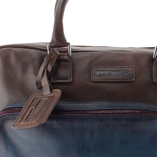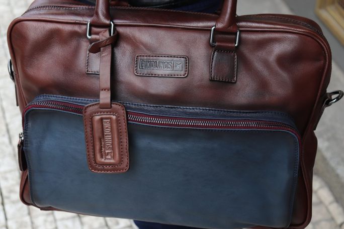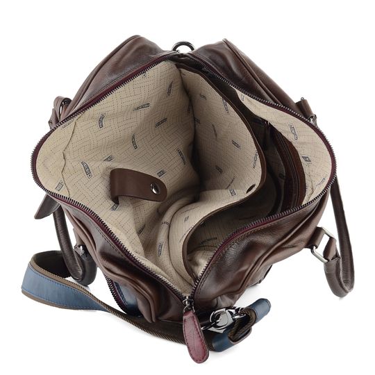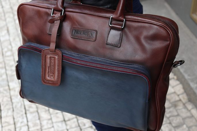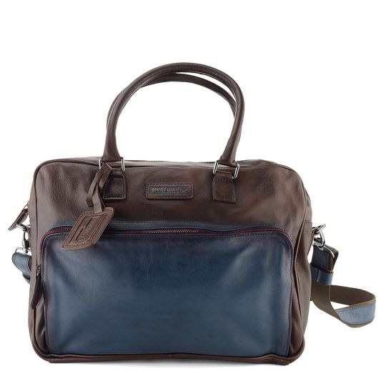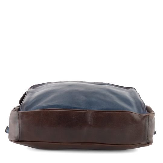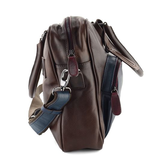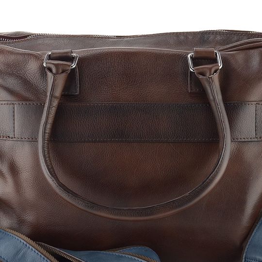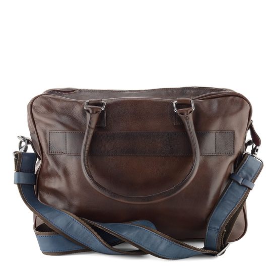 Kabela pro pány i dámy v tmavě hnědém a modrém stylu se stínováním poslouží do práce, na cesty i jinde. Pojme notebook/tablet a mnohé další nezbytnosti.