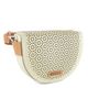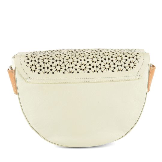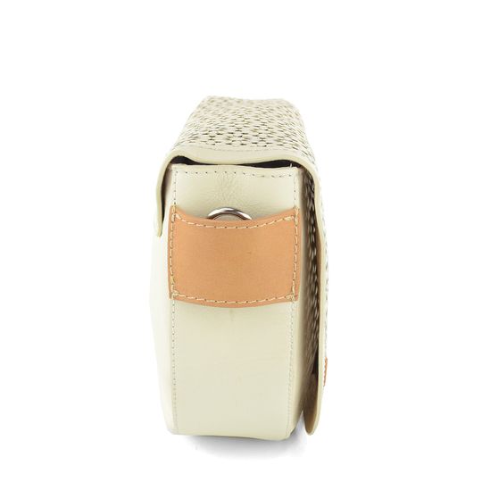 Dámská luxusní kožená crossbody kabelka v světlé krémové barvě s laserem zdobenou klopnou.
