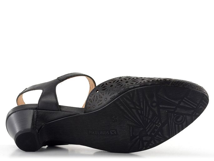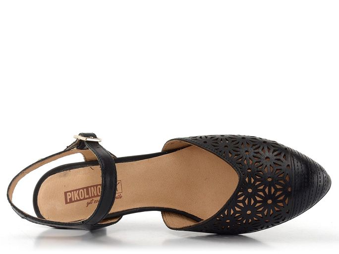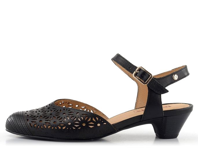 Dámské lodičky s volnou patou, v černé barvě a s prořezávaným vzdušným vzorem.