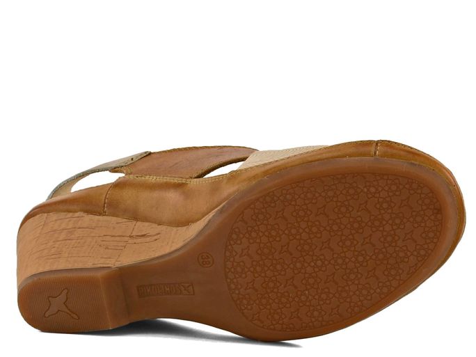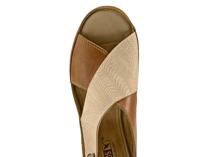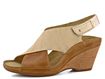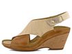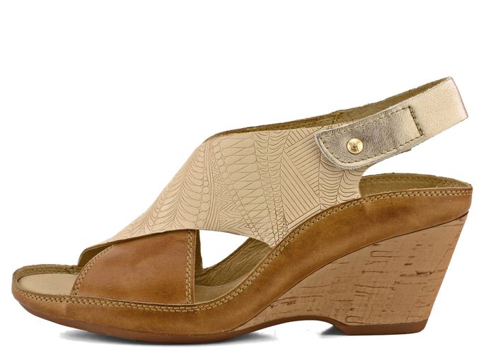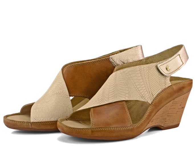 Dámské kožené sandály se širokými kříženými pásky, v přírodní a béžové barvě, s patním páskem na suchý zip a a s vyšším klínkem.